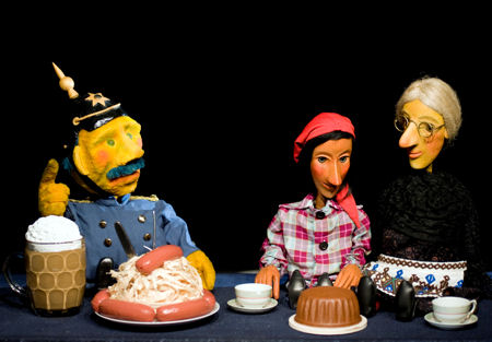 Zwei Spieler entwickeln scheinbar spontan eine etwas andere Kaspergeschichte. Dass der Räuber in Wachtmeisteruniform gegen Großmutter und Kasper den Kürzeren zieht, ist dabei selbstverständlich. Gespielt wird "Kasper in der Drachenhöhle" mit Tischfiguren auf einer eigens gestalteten, für eine offene Spielweise konzipierten Bühne. |